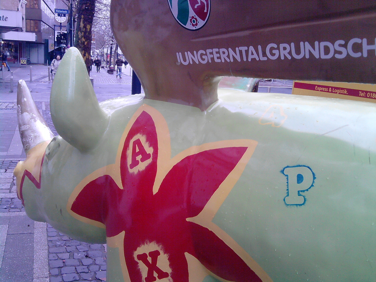 Així que després de molt de buscar, sembla que el rinoceront alat és el símbol de la Filharmònica de Dortmund, que a principis de la dècada del 2000 es va celebrar una efemèride relacionada i que van trobar que seria graciós envair la ciutat amb una estampida de més de 100 rinoceronts, cadascun diferent i que acabada la festa es va decidir deixar alguns. I també he sentit parlar d'alguna cosa semblant amb vaques, cavalls i lleons alats en altres ciutats. Definitivament, el món s'aproxima a la seua destrucció.